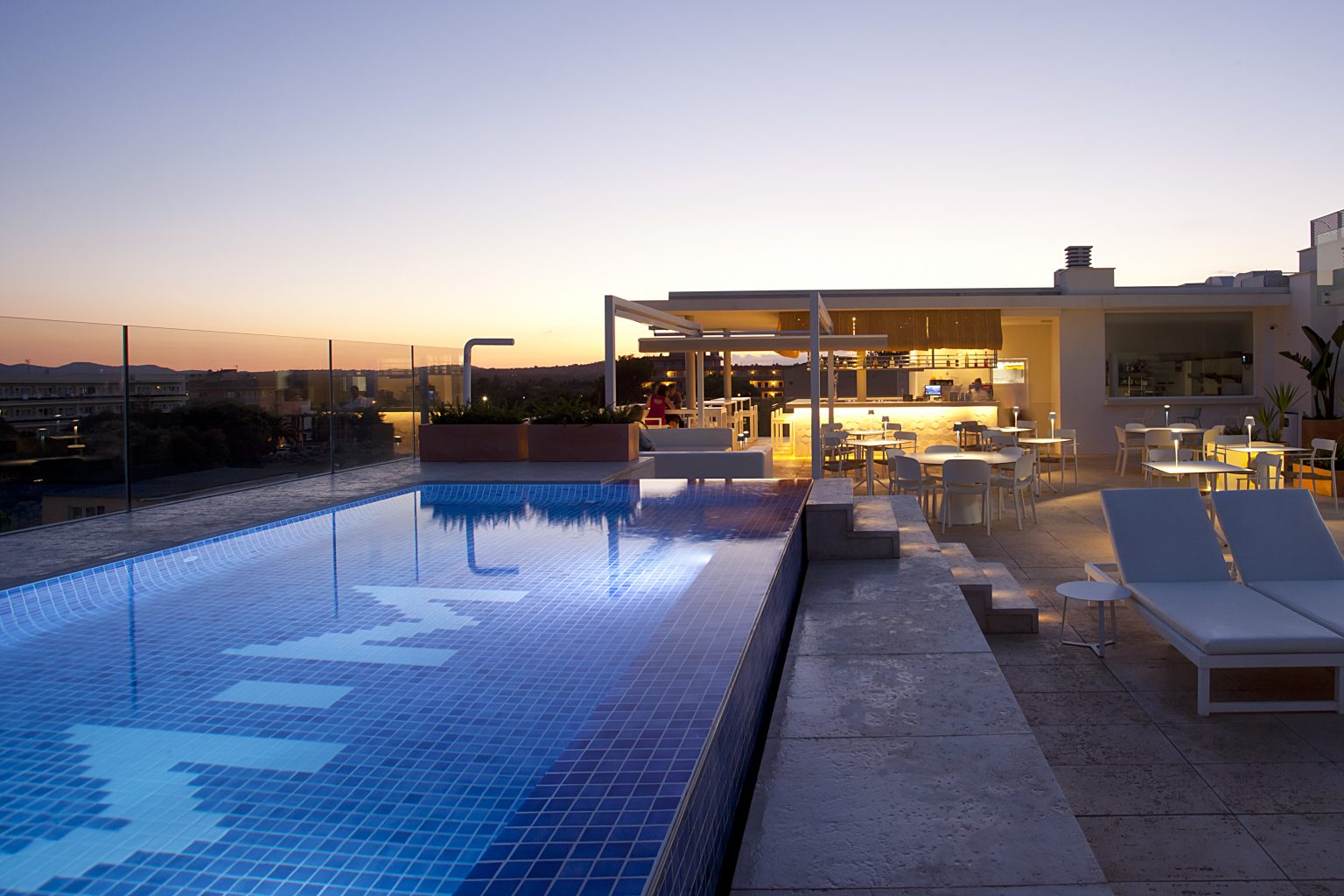 El Hotel cuenta 98 habitaciones, pool bar, SPA y circuito de agua, gimnasio con equipamiento de última generación, zona de masaje y relajación, sauna, hammam, un coqueto y confortable lobby conectado con la piscina a través de un porche muy mediterráneo, el restaurante LAND con terraza a pie de paseo marítimo y 2 roof top en la azotea del edificio: el BAR FLY con piscina desbordante y una terraza-solarium para disfrutar de las maravillosas vistas panorámicas al mar y al fantástico paraje natural de la Punta de n’Amer, todo ello distribuido en unas instalaciones de 5.000 m2.