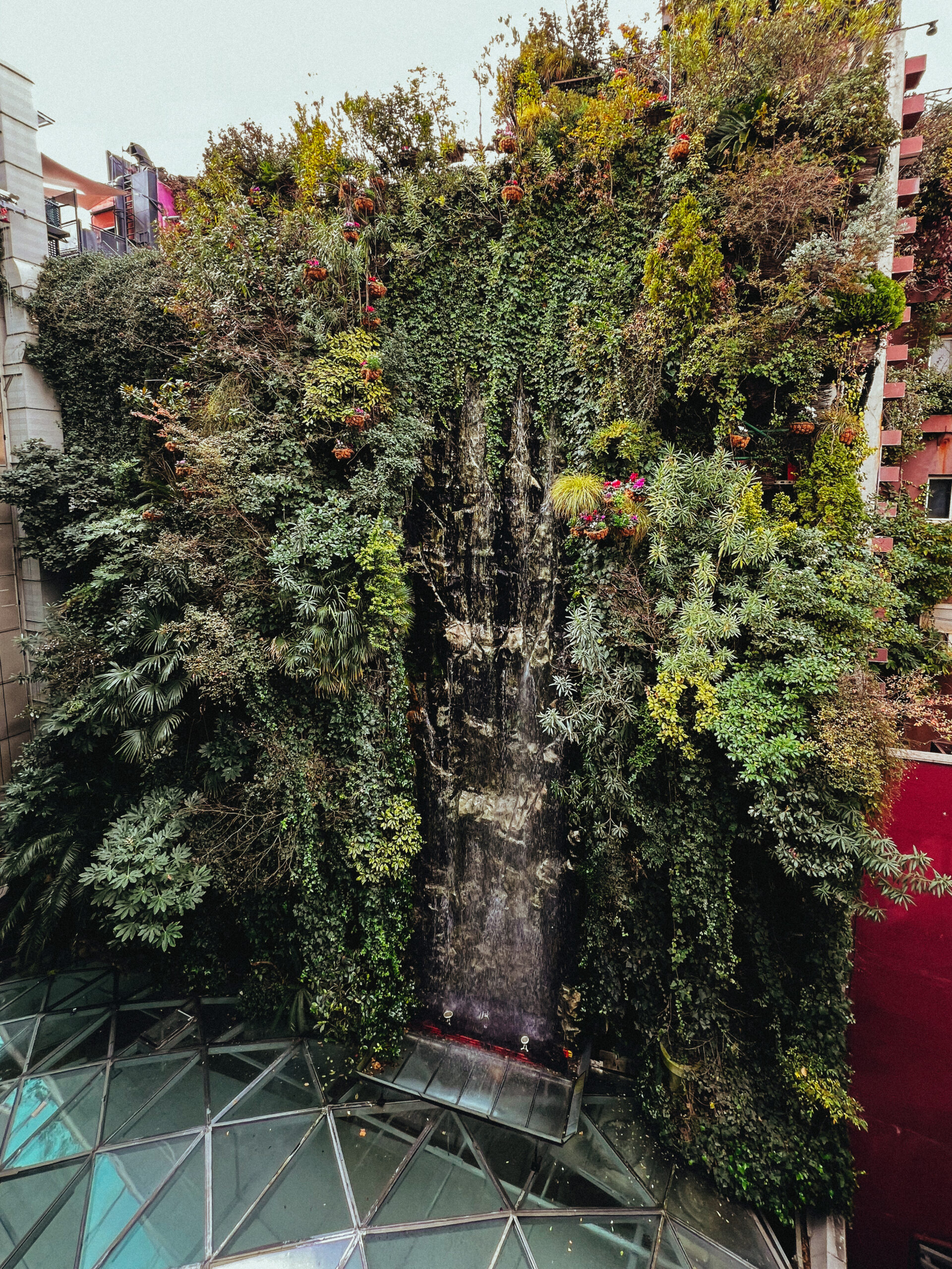 Su elemento más distintivo es un espectacular jardín colgante de 1.000 metros cuadrados que actúa como pulmón verde, mejorando la calidad del aire y ofreciendo un refugio de serenidad en medio de la ciudad. Este espacio natural alberga una variada biodiversidad y conecta visualmente con todos los rincones del hotel.