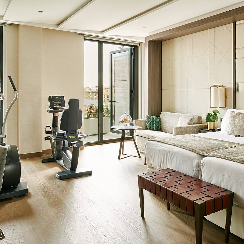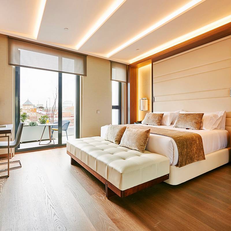 Entre todas ellas destaca la última, situada en la planta 17 del hotel y de 120 m2, con una extraordinaria panorámica del Palacio Real y a la Plaza de España, en la que se cuida el más mínimo detalle para garantizar una experiencia de lujo. Pensada para los huéspedes más cosmopolitas que buscan la máxima exclusividad, la Suite Presidencial cuenta con salón independiente, mesa de reuniones, área de fitness, dormitorio, cuarto de baño completo, área de vestidor independiente y aseo de cortesía. Para una experiencia todavía más cuidada, ofrece la posibilidad de contratar mayordomo.