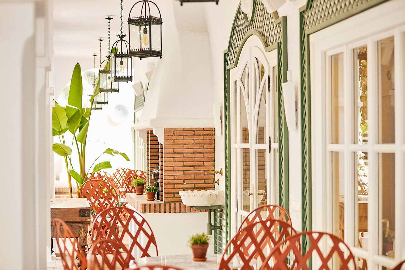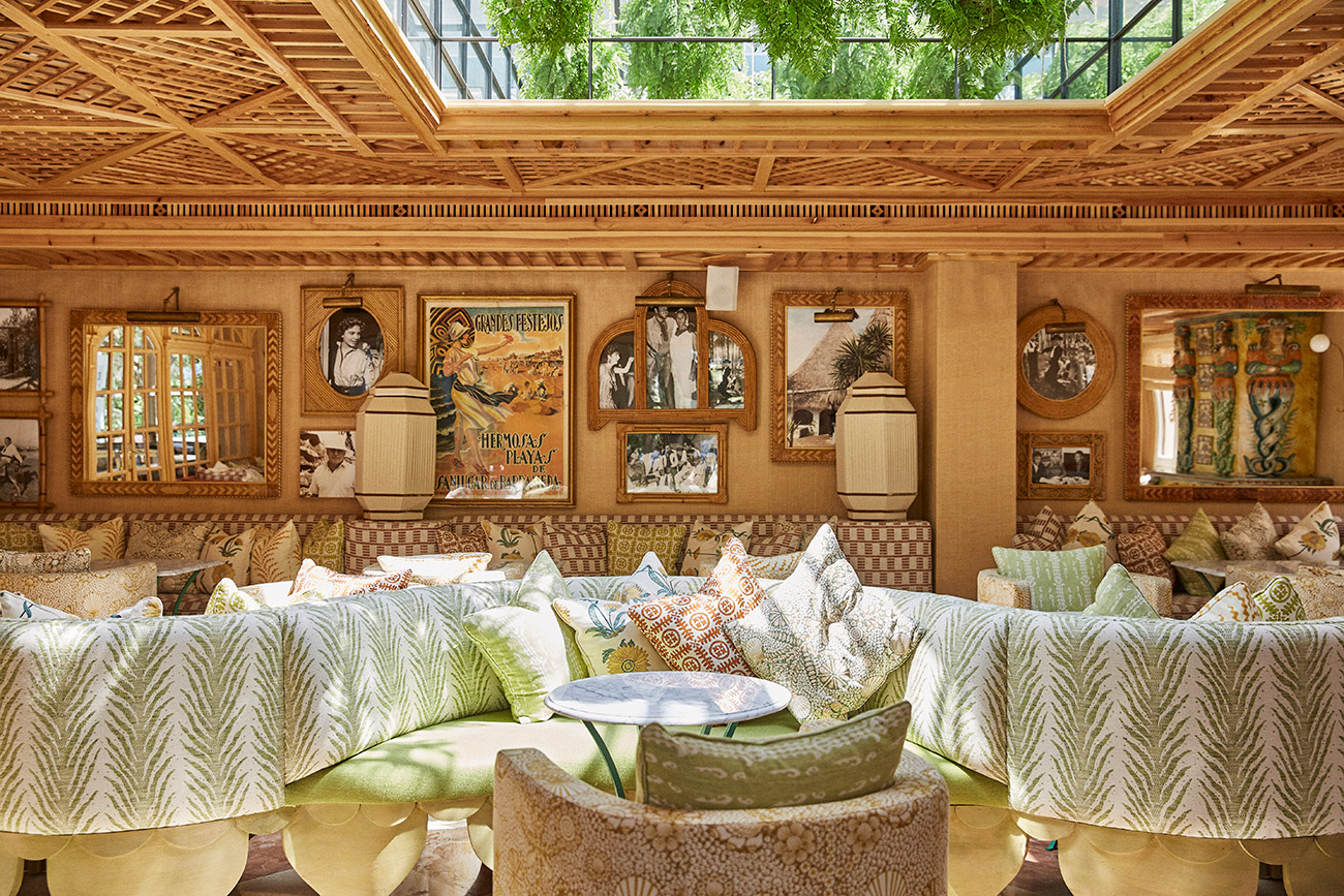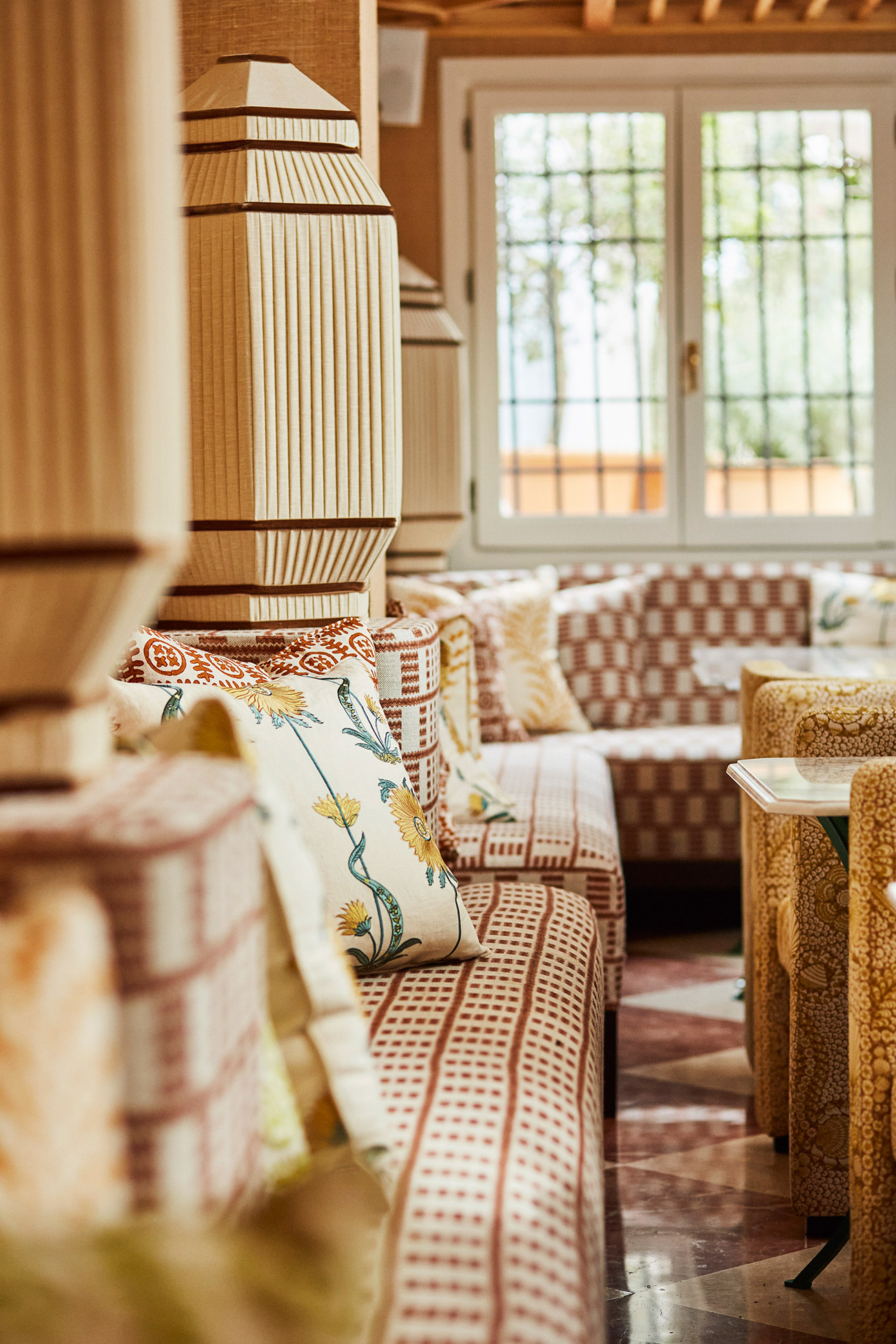 Los extravagantes interiores inspirados en el lugar en el que se ubica el hotel han sido diseñados por Marie-Caroline Willms y Johanna Haniel del estudio de diseño con sede en España, EMCI, que juegan con el ambiente retro de los restaurantes de California, una fuente de gran inspiración para el fundador, el Príncipe Alfonso von Hohenlohe. El espacio abarca dos zonas interiores: una con una barra circular como guiño a la Plaza de España de Sevilla, y un salón estilo invernadero con un diseño de inspiración botánica, con telas en tonos rojizos, índigo, azafrán y salvia, junto a paredes tapizadas con rafia y vegetación natural.