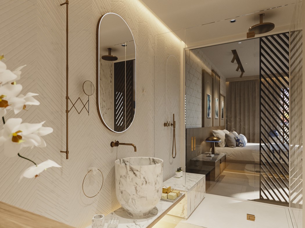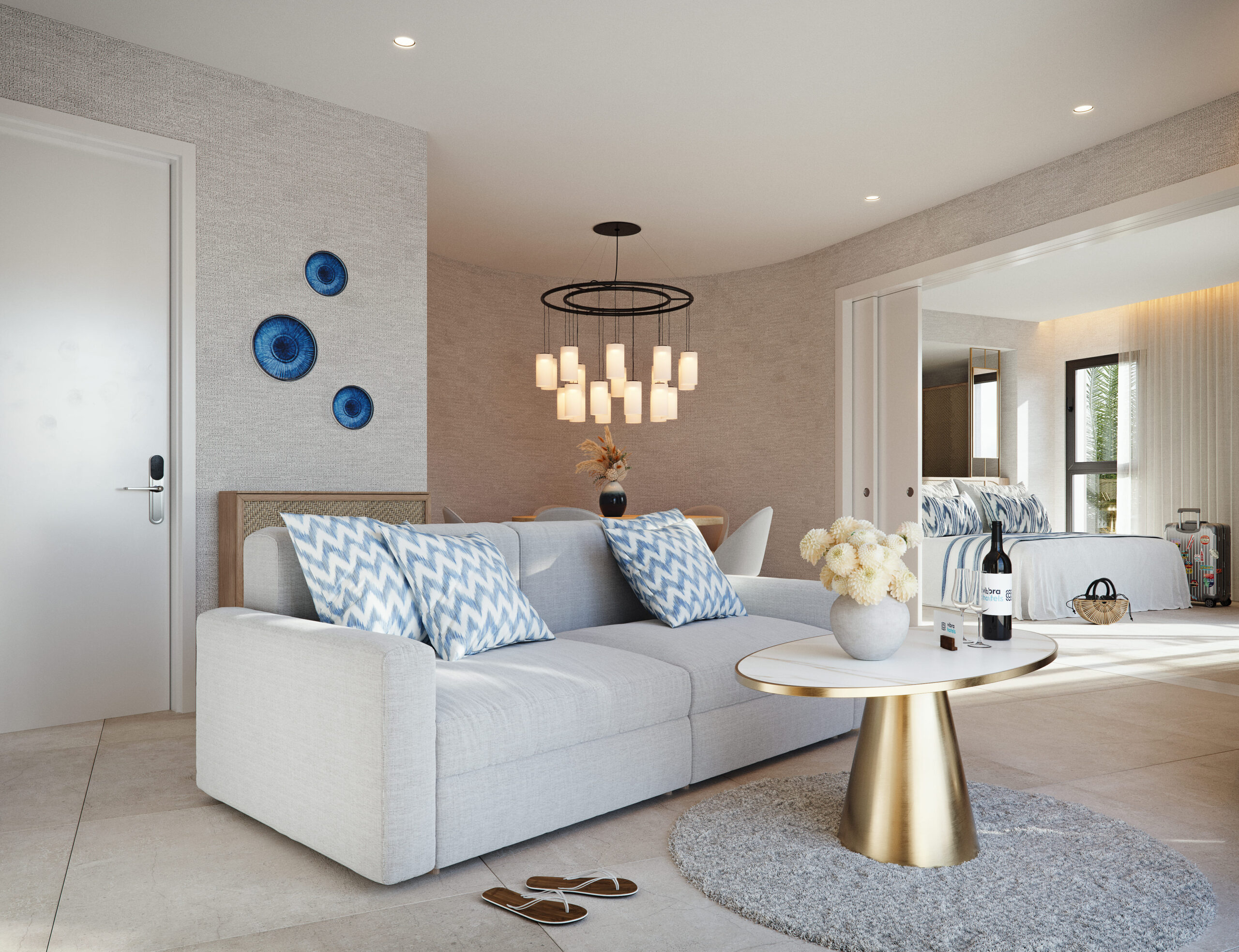 Sea View, en la franja costera, contará con una terraza que brinda impresionantes vistas panorámicas hacia las hermosas playas de San Antonio, un lugar donde disfrutar mientras el sol se hunde en el horizonte. En esta terraza destaca una lámina de agua que adquiere tonos dorados con el atardecer, y un espacio de camas balinesas tipo diván, inspiradas en el estilo de Naxos, la tierra que vio nacer al dios del Olimpo Zeus.